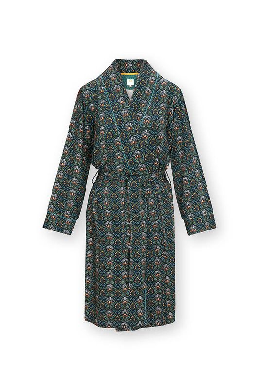 Der Nisha Kimono Bailamos Dunkelblau hat eine elegante Ausstrahlung. Dieser Kimono mit langen, passenden Ärmeln ist aus wunderbar weicher Stretch-Viskose gefertigt und wird mit einem passenden Gürtel für eine perfekte Passform geliefert. Das Bailamos Dessin besteht aus grafisch platzierten Blütentrauben und Blättern, die sich deutlich vom Hintergrund abheben und so ein klar wiederholtes Muster erzeugen.